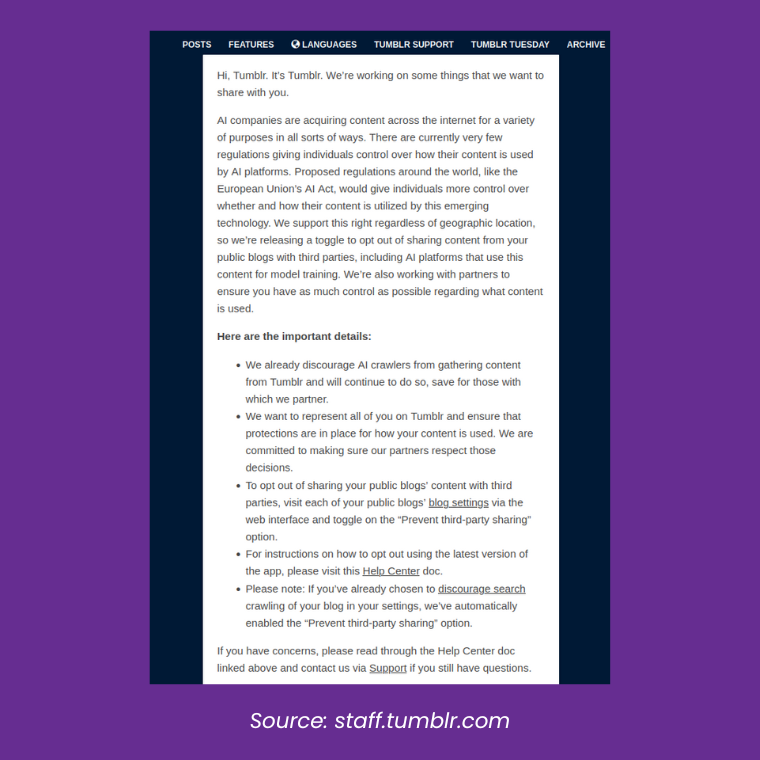 You are not opted out by design; you have to go to the settings of your Tumblr blog and opt out. Not good. We are really concerned about this development, even though, as we mentioned, we like Automattic, and even though it impacts Tumblr (a proprietary platform at the moment) and websites on WordPress.com, not self-hosted open-source software that the company provides.